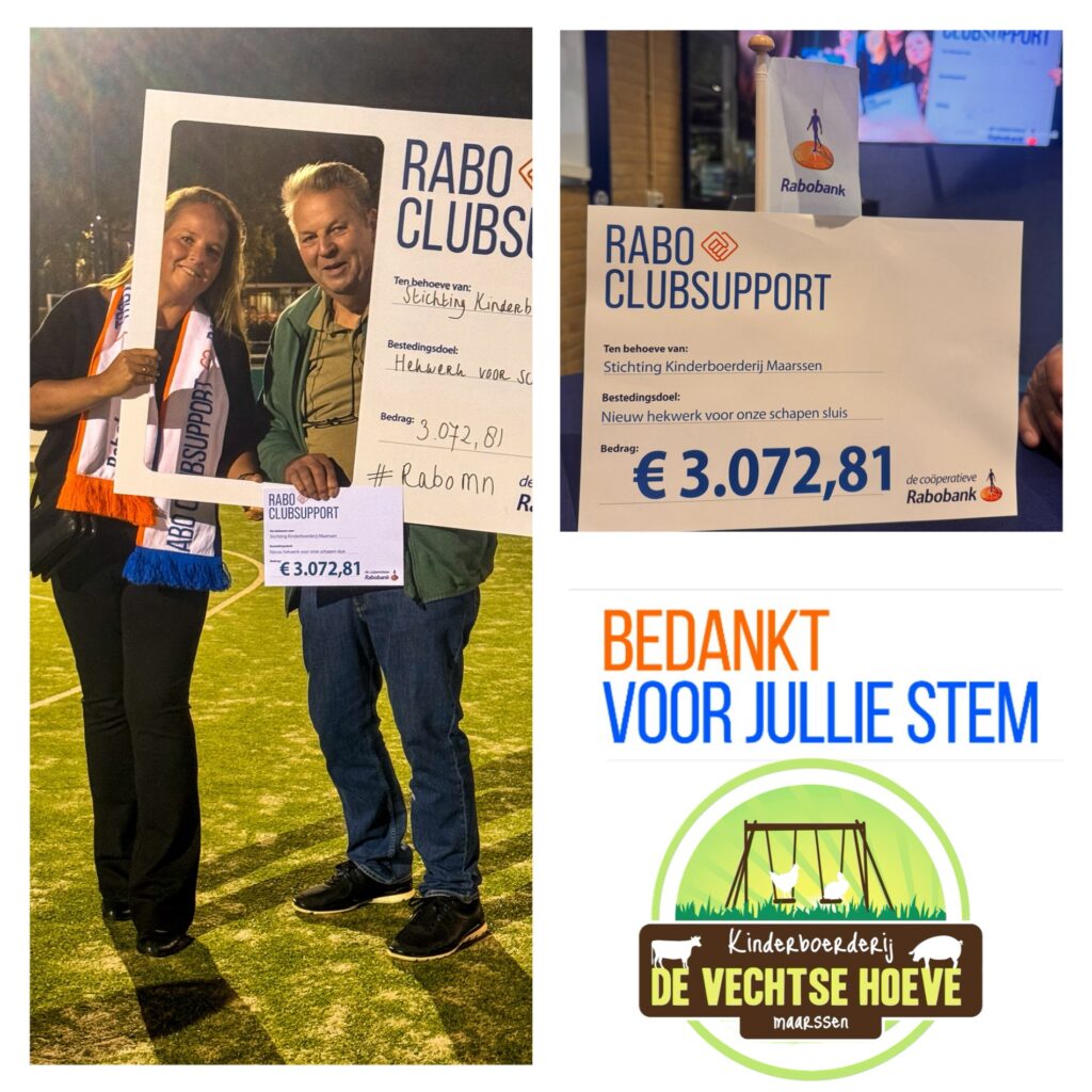 Bedankt trouwe achterban van Kinderboerderij De Vechtse Hoeve! Zojuist hebben we een cheque van maar liefst €3.072,81 in ontvangst mogen nemen van de Rabobank Rabo clubsupport actie. Wat een top bedrag!!! Rabobank en alle Rabo-leden die op ons gestemd hebben enorm bedankt Iedere stem leverde ongeveer 11,00 op. Alle stemmen bij elkaar maakt dus een …